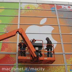 Giornata piovosa e fredda, un po’ anomala rispetto al clima di San Francisco temperato anche in inverno. La prima tappa della mattinata californiana è d’obbligo. Lo Yerba Buena Center che accoglierà l’evento di domani è in piena fase di allestimento e all’esterno si sta completando il ridecoro della facciata con il grande logo Apple e la tavolozza di colori che rimanda alll’invito.