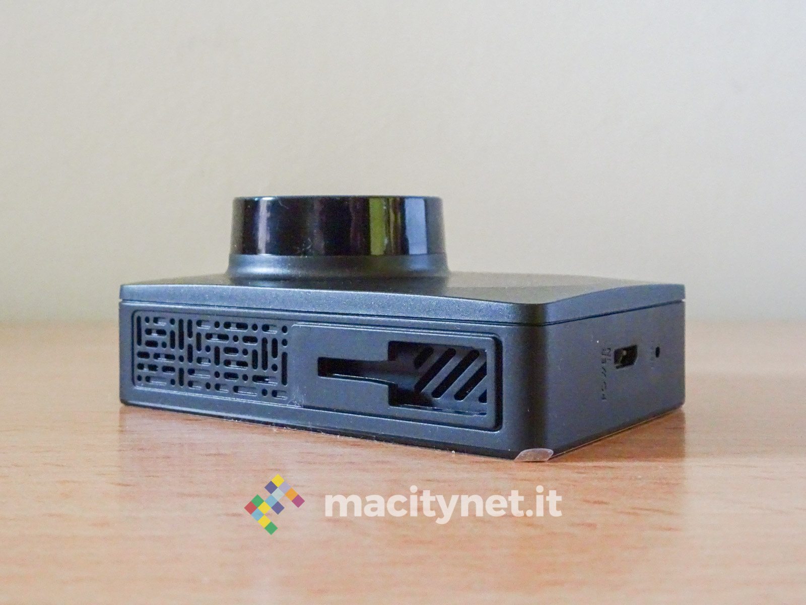 Esteticamente è praticamente identica alla sorella maggiore, con scocca in policarbonato e design squadrato. Incorpora uno speaker sul fondo, ingresso microUSB per l’alimentazione e pulsante per il Reset sul lato destro, slot microSD per l’archiviazione delle registrazioni (supportate fino a 64 GB classe 10 formattate in FAT32) sul lato sinistro, aggancio proprietario per la clip da parabrezza sul bordo superiore e schermo LCD da 2.7 pollici risoluzione 960 x 240 pixel accompagnato da quattro pulsanti per la gestione del menu sul retro.