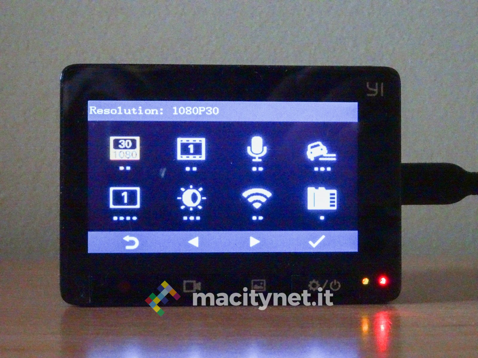L’azienda ha mantenuto la stessa semplicità di utilizzo: dopo averla fissata al parabrezza e collegata all’alimentazione, la camera si accenderà in pochi secondi avviando automaticamente la registrazione video (purché sia inserita una microSD). Il menù è simile ma più spoglio di funzionalità: innanzitutto è possibile registrare video soltanto in Full HD a 1080p @30 fps oppure in HD a 720p @30 fps. Si può attivare o disattivare il microfono, regolare la sensibilità dell’accelerometro, decidere il timeout di standby del display (tra 1–5–10 minuti o sempre acceso), regolare la luminosità del display, attivare o disattivare il WiFi per il controllo remoto via smartphone, formattare la microSD, regolare data e ora, suoni, volume e ripristinare le impostazioni di fabbrica.