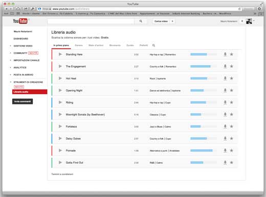 YouTube ha lanciato una nuova sezione denominata Audio Library nella quale è possibile trovare brani utilizzabili gratuitamente come colonna sonora per i filmati. Da una sezione dedicata è possibile cercare i brani per genere (alternativa e punk, country blues, ecc.), stati d’animo (cupo, arrabbiato, triste, romantico, ecc.), strumenti (batteria, archi, organo, ecc.), durata. Dopo aver selezionato un brano, è possibile scaricare la traccia (MP3 campionati a 320 kb/s) o aggiungerla alla sezione dei preferiti.