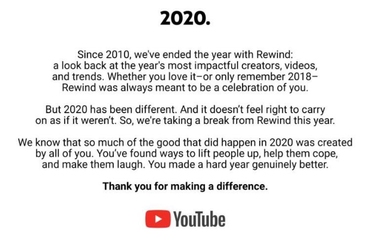 Quest’anno niente YouTube Rewind 2020: lo ha annunciato la società attaverso una nota condivisa in un’immagine su Twitter che sta rapidamente facendo il pieno di like. «Il 2020 è stato diverso. Non ci sembra giusto andare avanti come se niente fosse. Quindi, quest’anno ci prendiamo una pausa da Rewind» è il sunto del discorso, un chiaro riferimento alla pandemia di coronavirus che ha sconvolto il mondo intero.