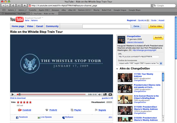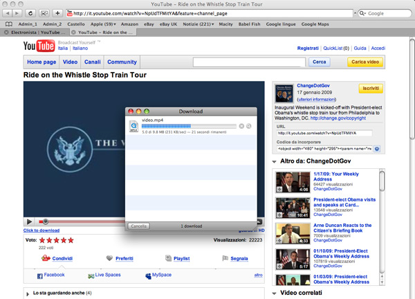 Quando disponibile il nuovo comando per il download è posizionato in basso a sinistra, proprio sotto al riquadro principale del filmato. La funzione è disponibile per un numero limitato di video e film realizzati dagli utenti: in queste ore negli Stati Uniti e non solo, stanno riscuotendo molto successo i filmati del viaggio in treno del neo presidente eletto Obama da Philadelphia a Washington, reperibili a partire da questa pagina di YouTube.