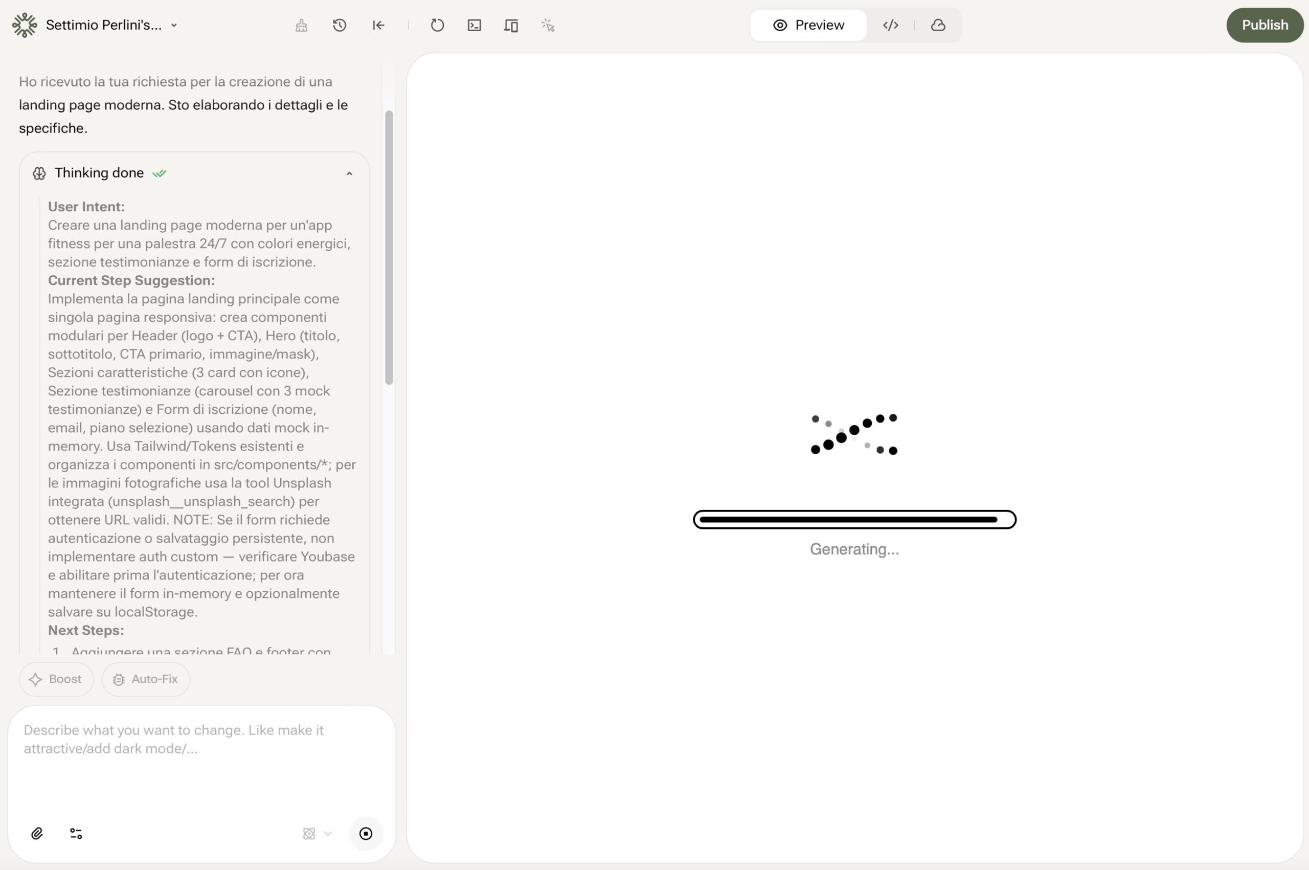 Nel giro di pochi minuti (5 nel nostro caso) l’AI progetta layout, struttura, stile grafico e componenti interattive e voi potete modificarla con strumenti visuali direttamente sullo schermo, come in un editor professionale… ma senza la complessità tecnica.