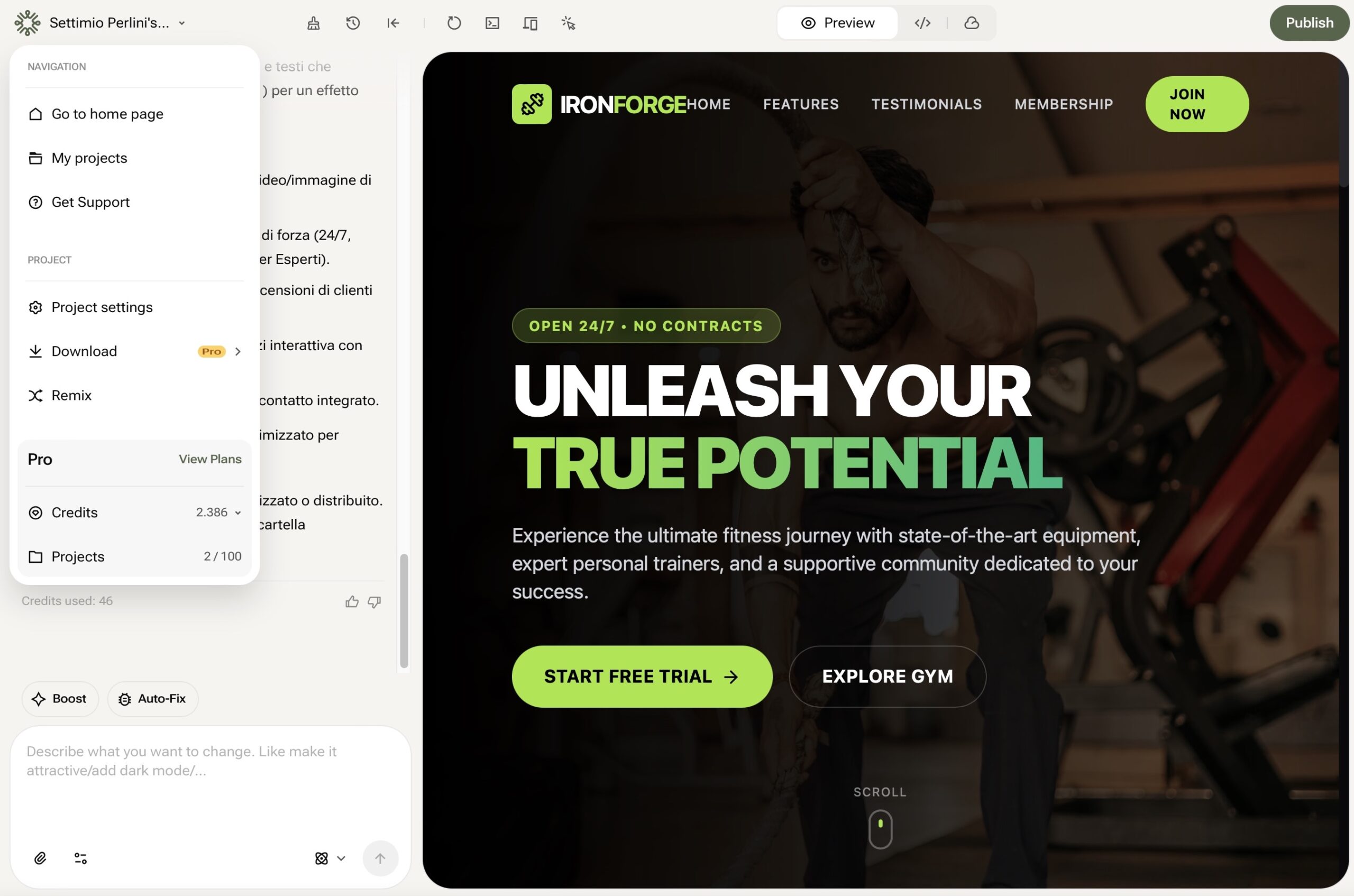 Boost con un clic per trasformare la grafica: il pulsante Boost analizza la vostra pagina e la migliora in ogni aspetto: palette, tipografia, spaziatura, animazioni, servendosi dell’AI e di un campionario infinito di stili coerenti.