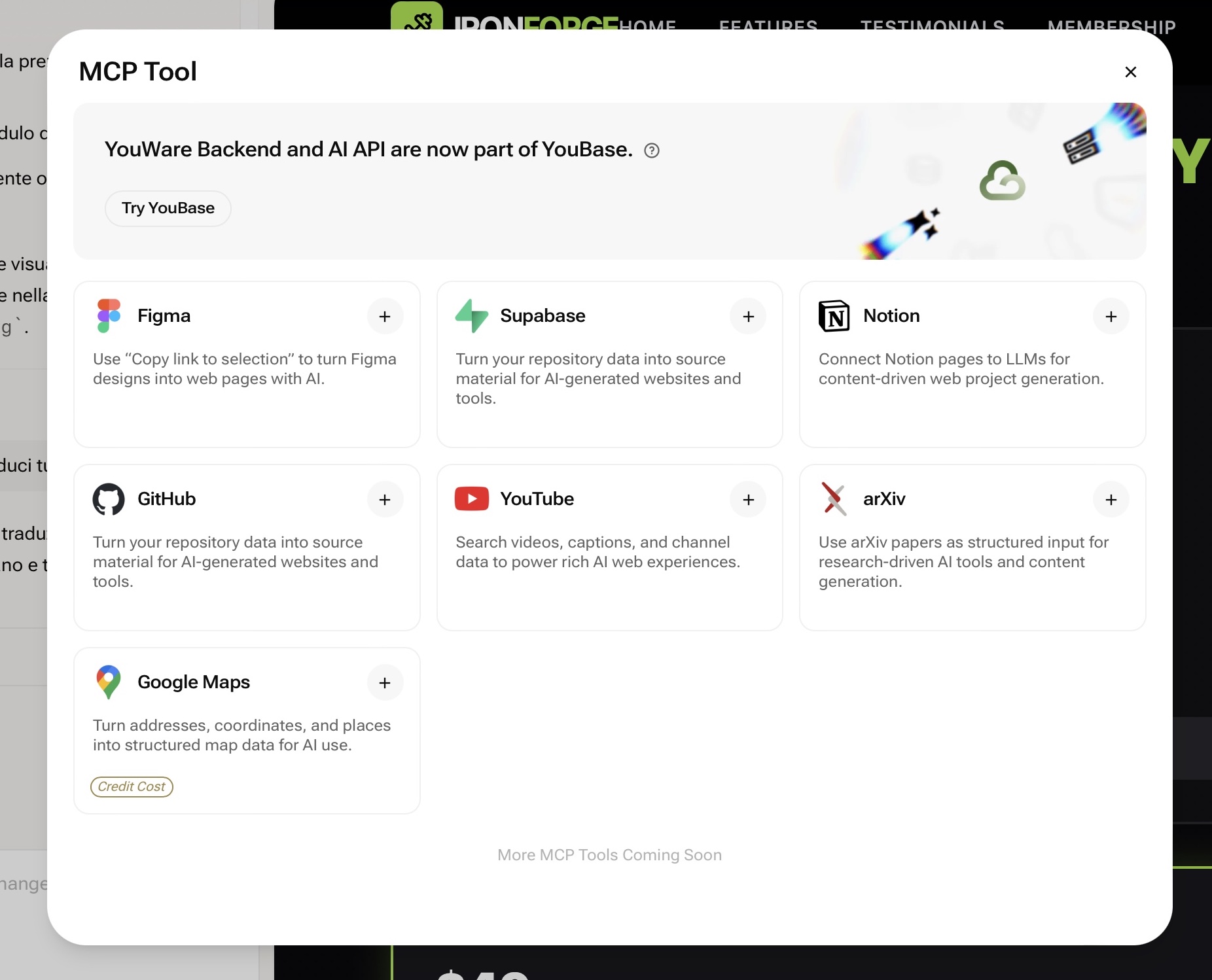 I “MCP Tool” sono invece strumenti/connessioni basati su Model Context Protocol (MCP) che permettono di collegare il vostro progetto a servizi esterni (es. ChatGPT, Figma, Notion e molti altri) per estenderne le capacità: importare dati, automatizzare workflow, generare o sincronizzare contenuti e rendere l’app più “connessa” al vostro ecosistema. YouWare li propone e gestisce anche tramite un MCP Market dove potete scoprire e installare tool pronti all’uso.