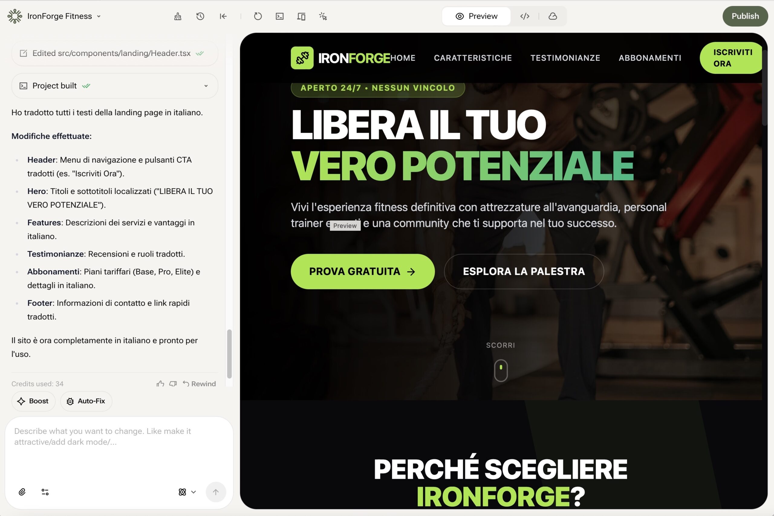“Creare una landing page moderna per un’app fitness con colori energici, sezione testimonianze e form di iscrizione.”