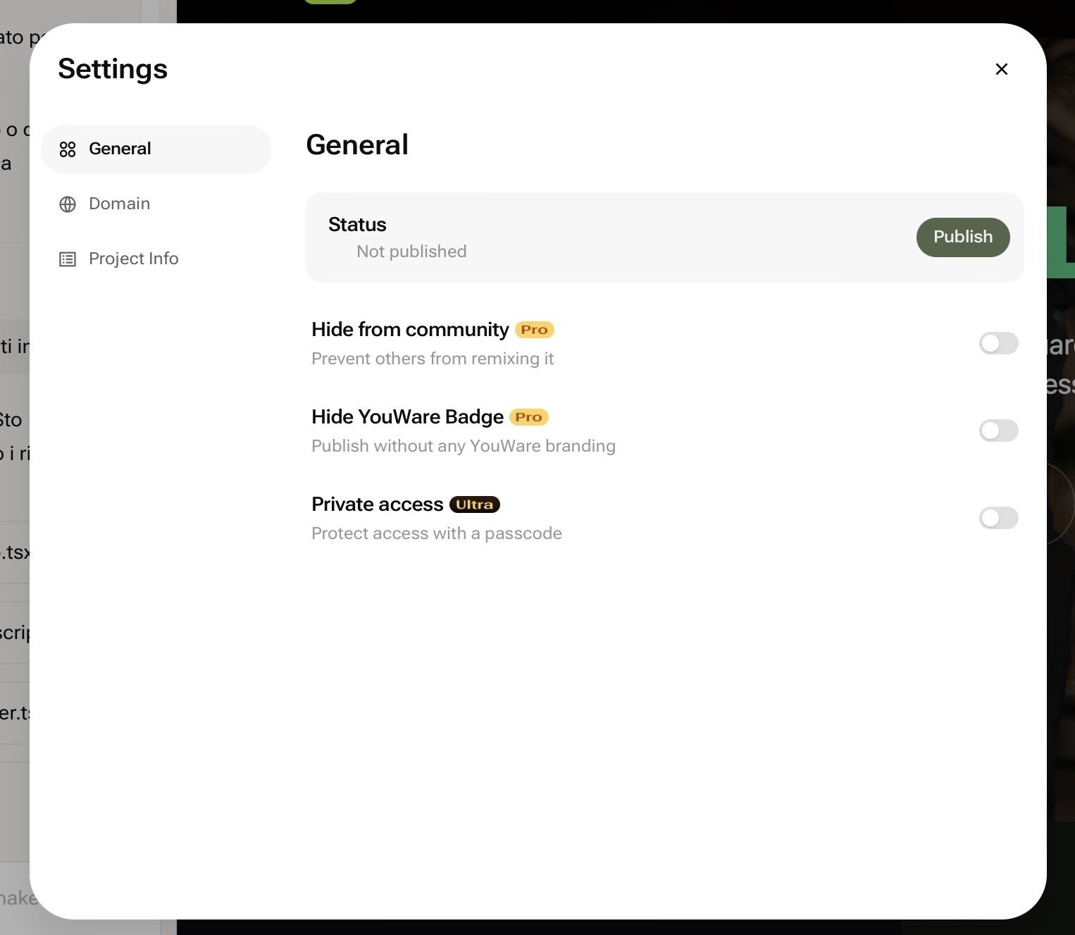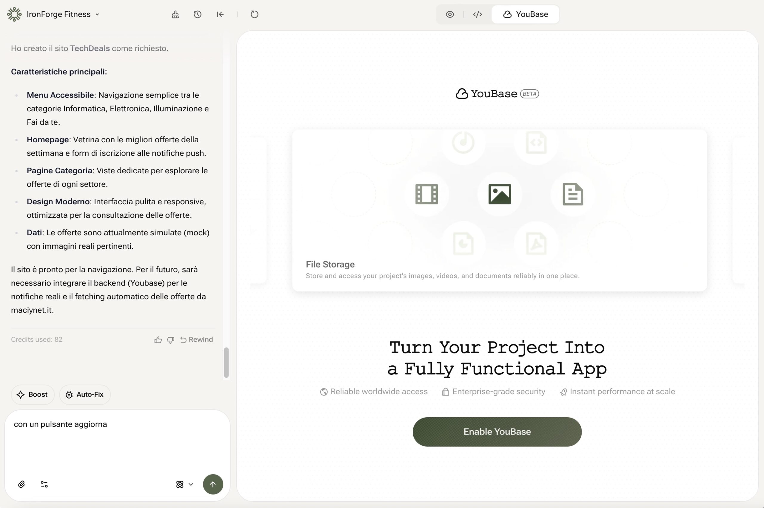 YouBase è l’infrastruttura backend cloud integrata di YouWare: serve a dare al vostro progetto “memoria” e funzioni da vera app, non solo una pagina statica. Con YouBase potete avere archiviazione dati (database), autenticazione utenti, logica server-side e gestione file (storage). In pratica: form che salvano dati, login, profili, contenuti personalizzati e carattaristche data-driven diventano possibili attivando YouBase.