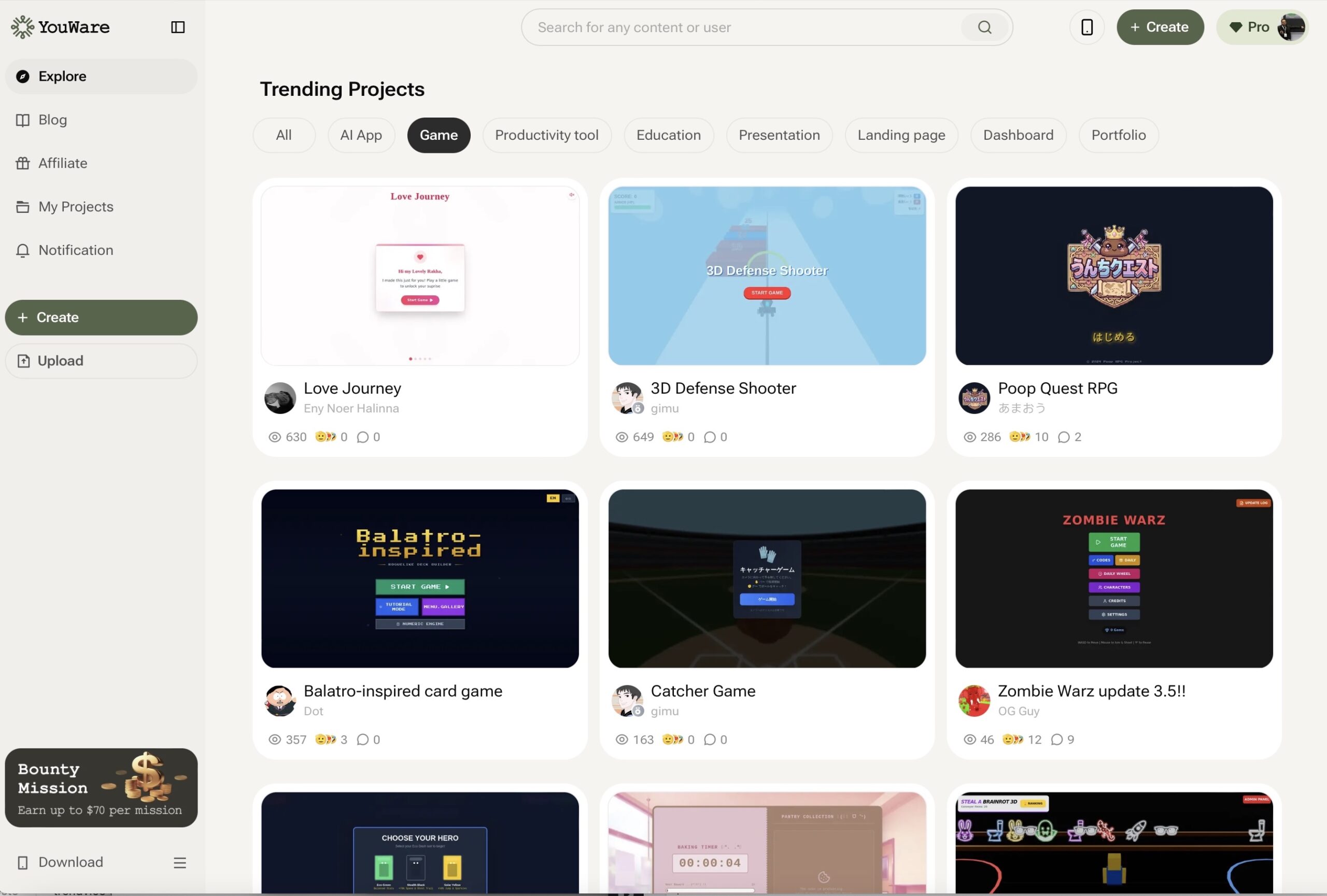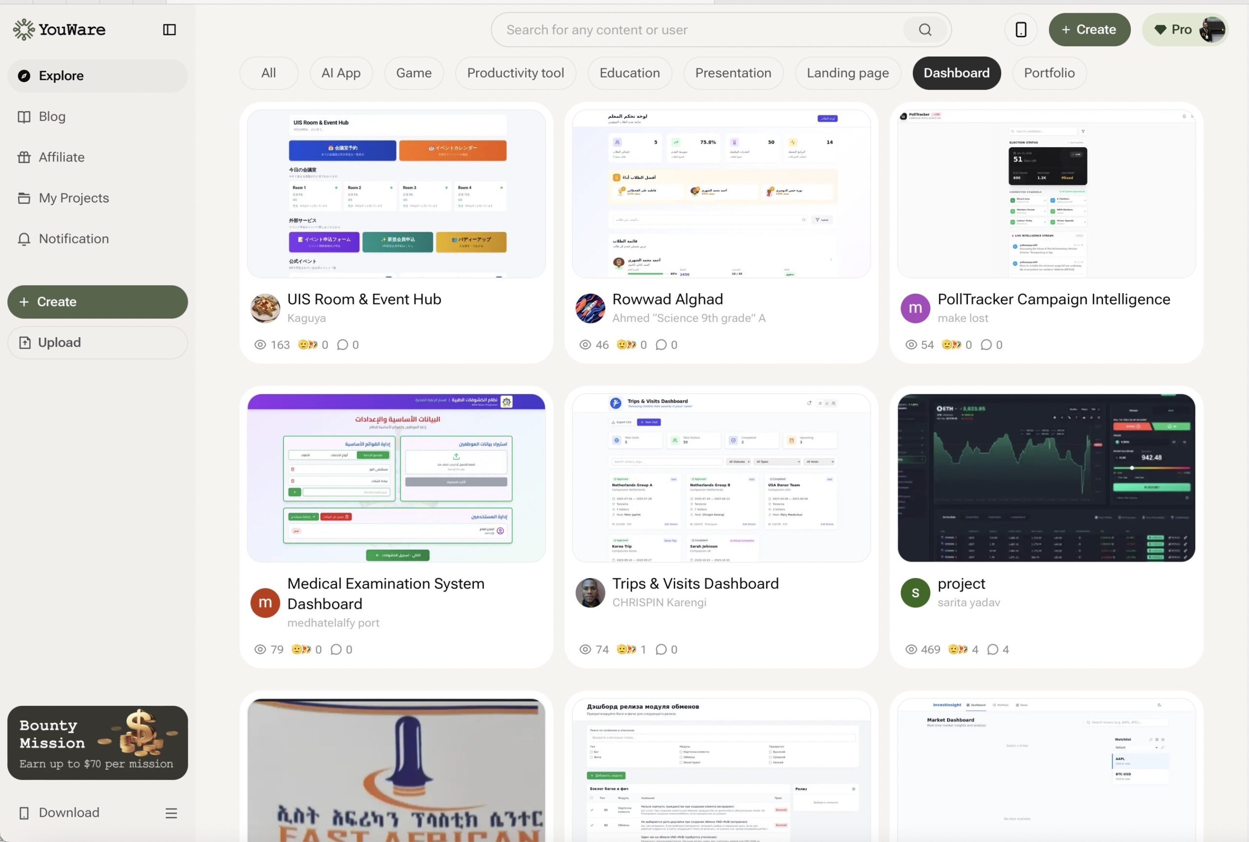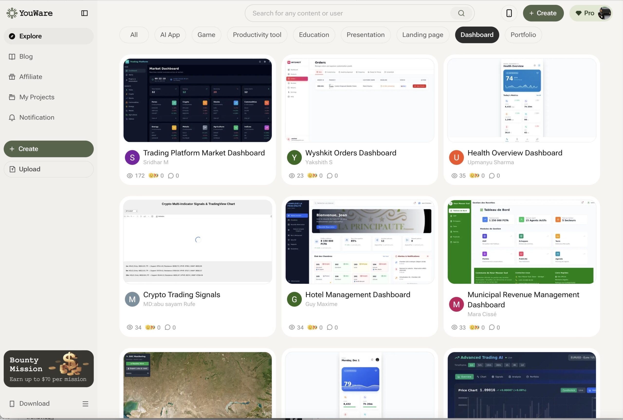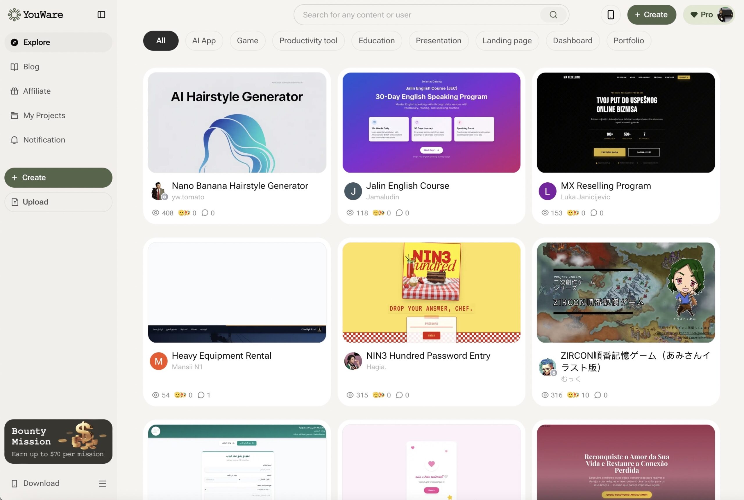 Explore raccoglie progetti reali creati dalla community: siti web, giochi, landing page, dashboard, prototipi di app, strumenti interni e sperimentazioni creative di ogni tipo. Accanto a questi trovate template pronti da remixare, che potete clonare con un clic e modificare liberamente. È un modo rapido e naturale per imparare come funziona YouWare e per accelerare il processo creativo, soprattutto se non avete competenze di programmazione.