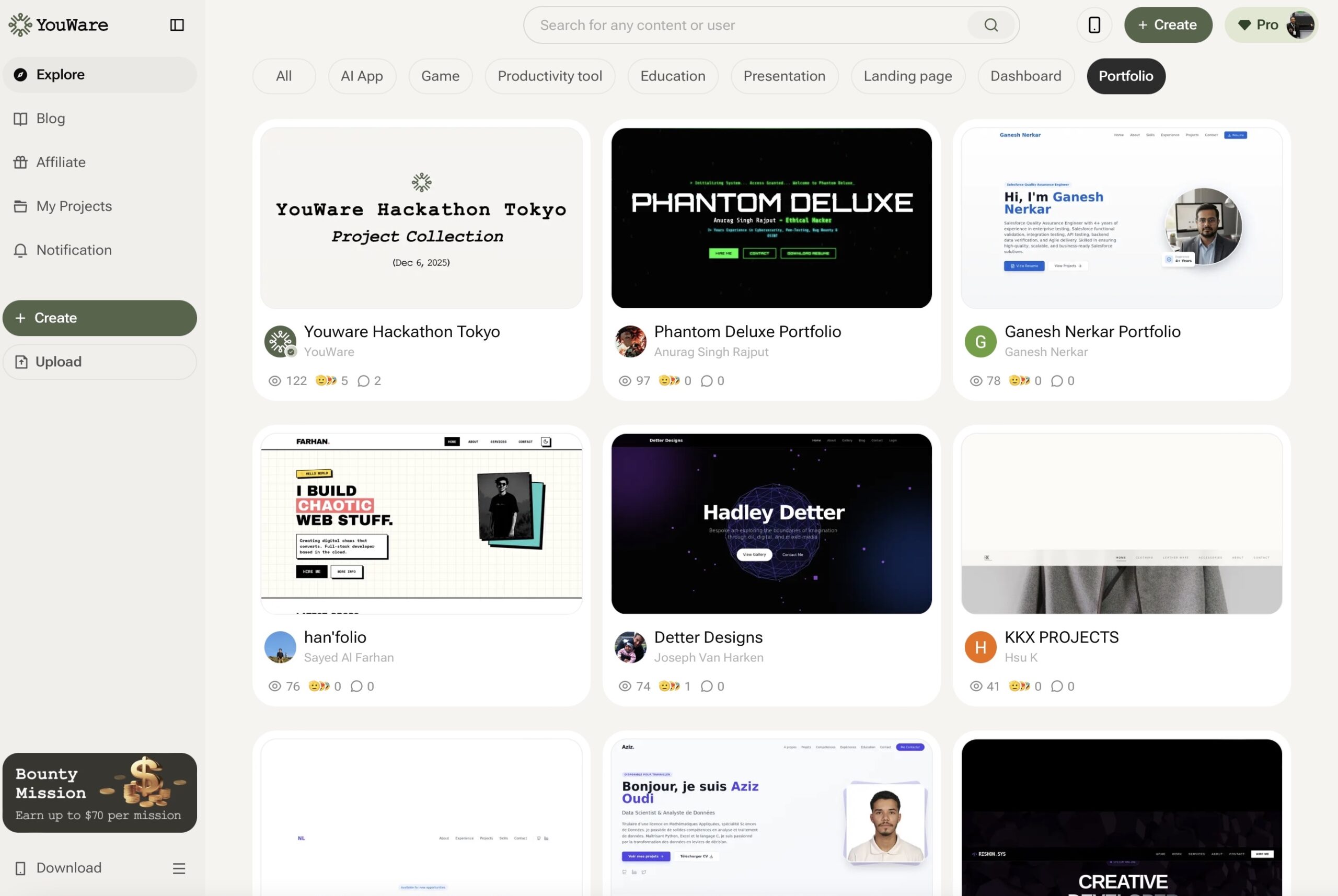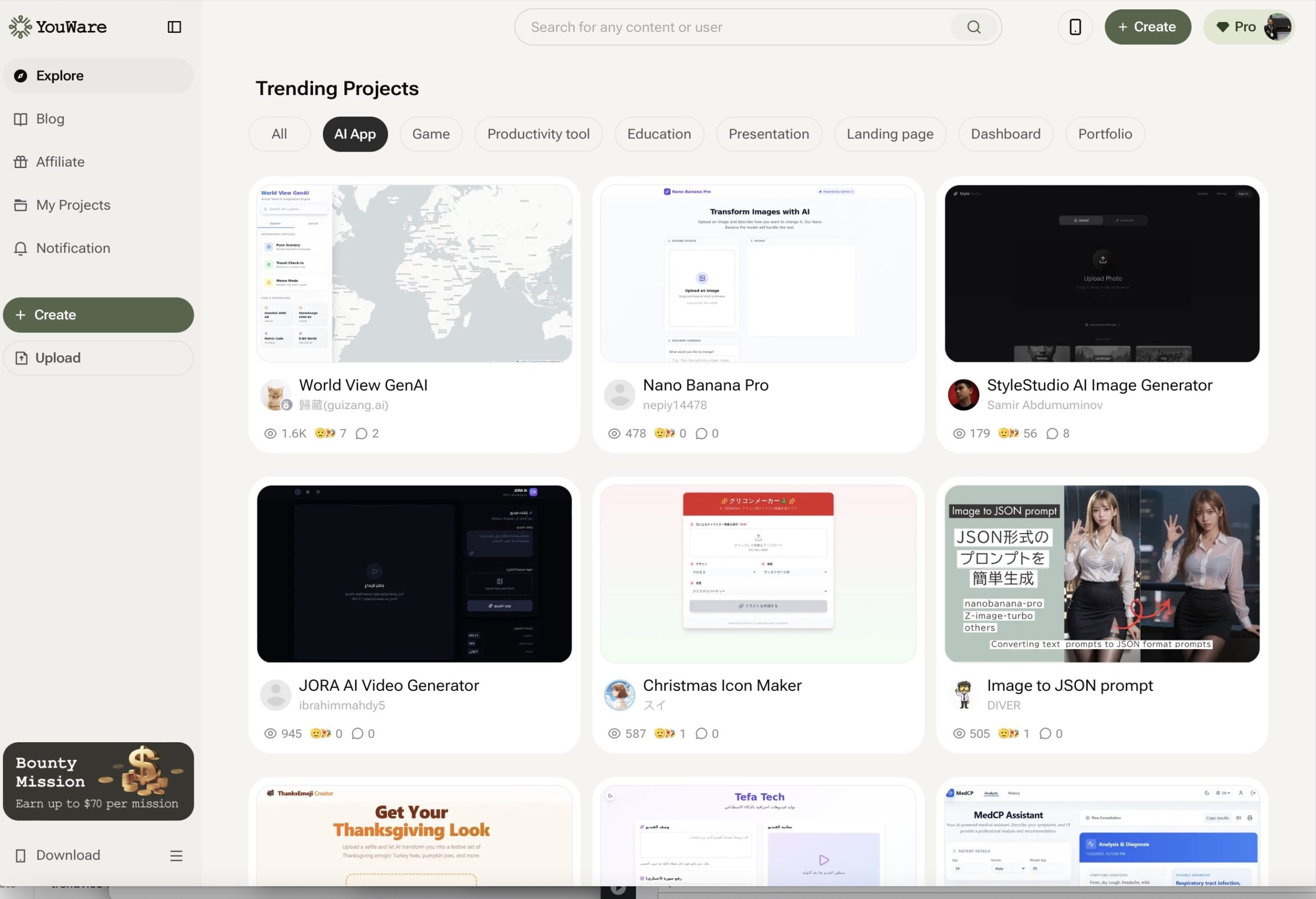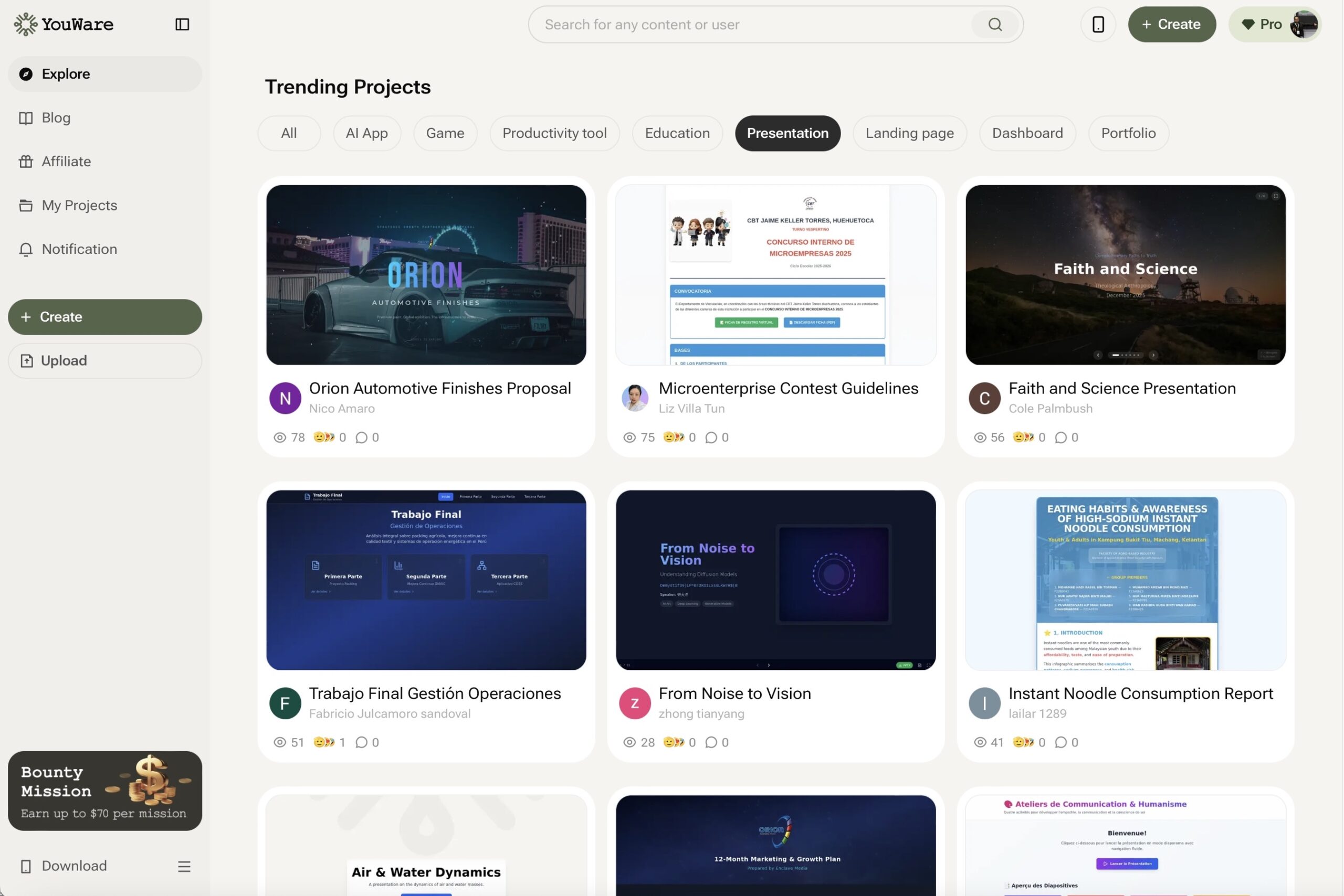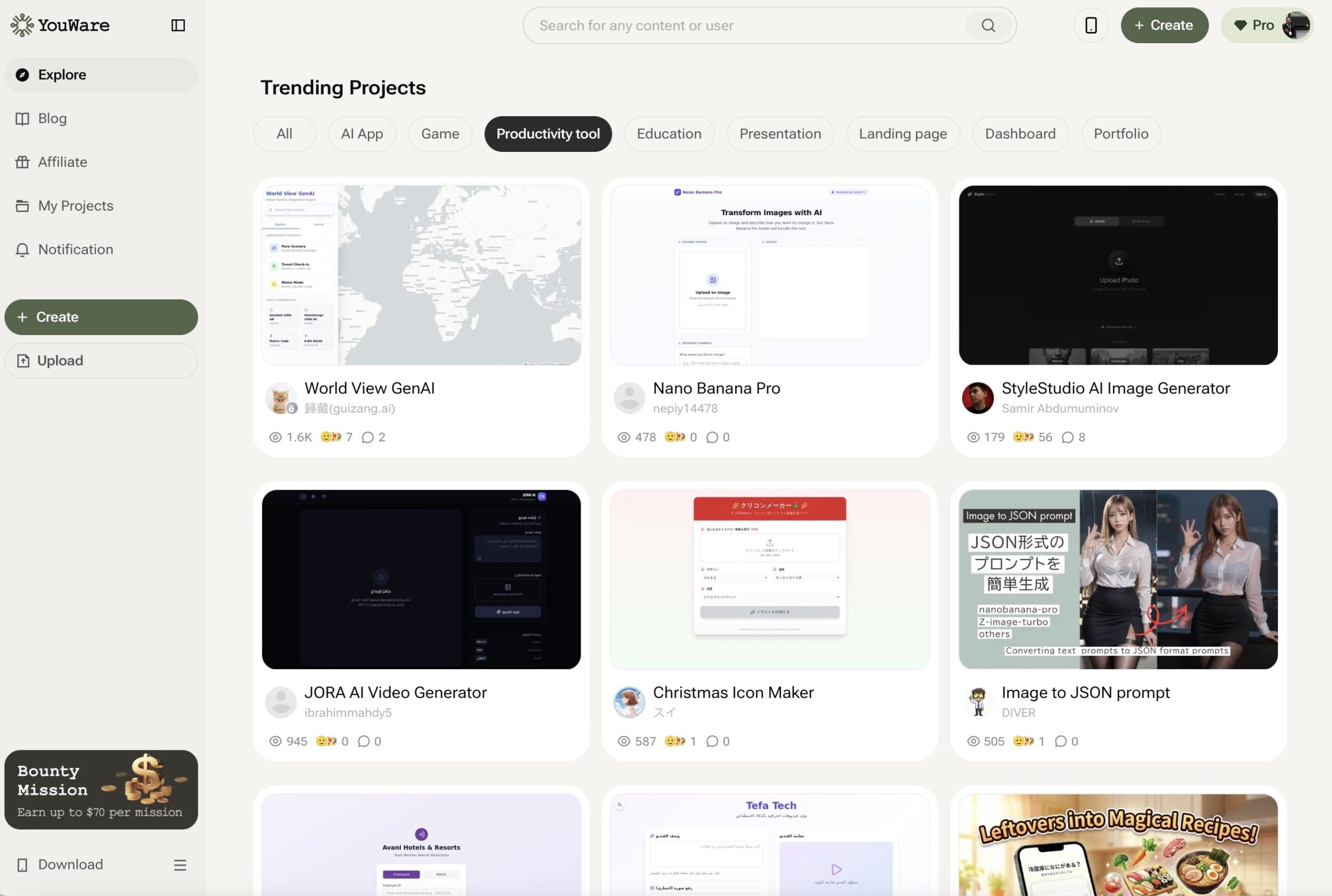 Explore raccoglie progetti reali creati dalla community: siti web, giochi, landing page, dashboard, prototipi di app, strumenti interni e sperimentazioni creative di ogni tipo. Accanto a questi trovate template pronti da remixare, che potete clonare con un clic e modificare liberamente. È un modo rapido e naturale per imparare come funziona YouWare e per accelerare il processo creativo, soprattutto se non avete competenze di programmazione.