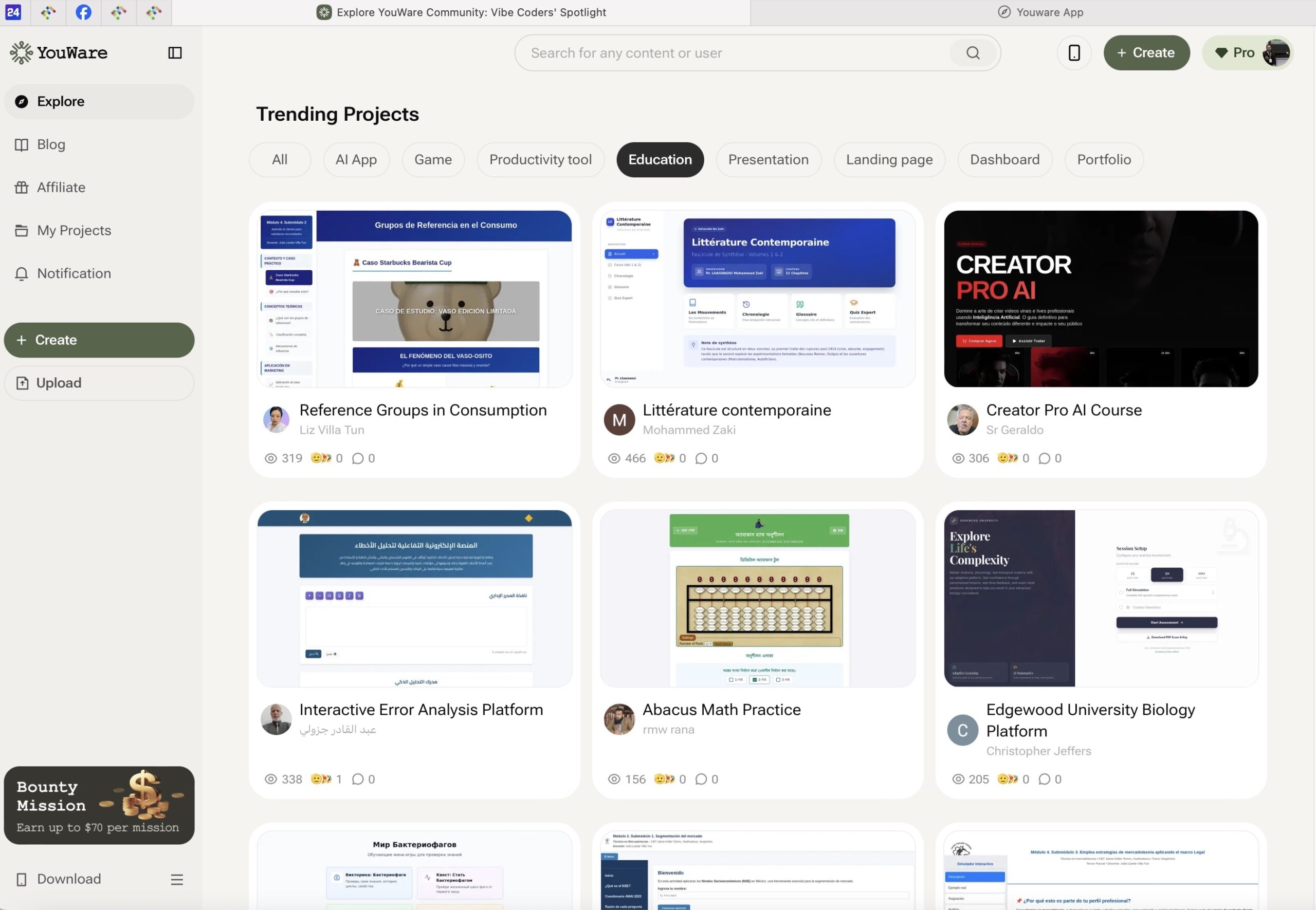 Nella sezione Explore di YouWare trovate il cuore più ispirazionale e “social” della piattaforma. È lo spazio pensato per scoprire cosa stanno creando gli altri utenti, capire in modo concreto cosa è possibile realizzare con il vibe coding e iniziare un progetto partendo da qualcosa che esiste già, invece che da una pagina completamente vuota.