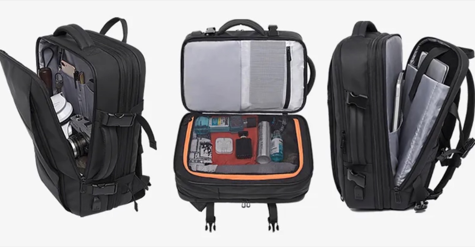 Dentro c’è spazio davvero per tutto: in una configurazione-tipo può contenere un portatile da 17,3″ con tastiera e mouse esterni, un tablet da 9,7 pollici, una reflex, un visore, un ombrello tascabile, un cellulare, un orologio, una maglia, un caricatore, un paio di cuffie e c’è spazio ancora per altri piccoli oggetti.