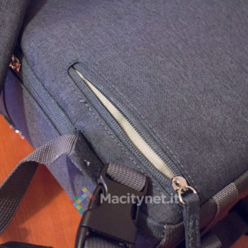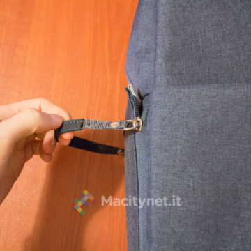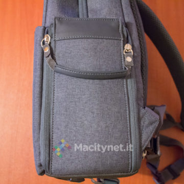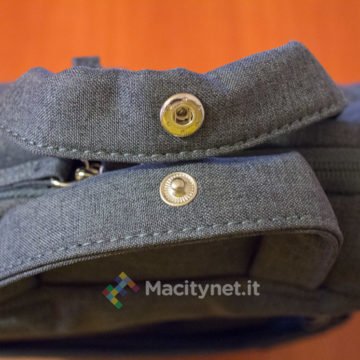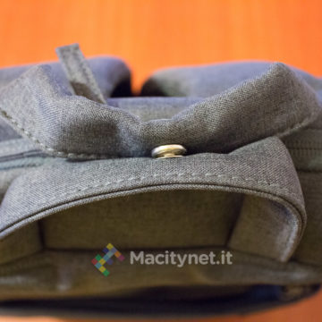 Dal lato opposto, invece, c’è una doppia maniglia che può essere più comodamente chiusa in una sola attraverso un bottone a pressione, aiutando nel trasporto dello zaino a mano.