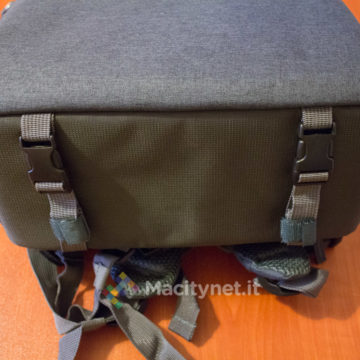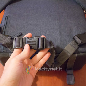 C’è poi una cintura (anche questa è regolabile e si apre e chiude attraverso una fibbia a clip) che aiuta a distribuire parte del peso intorno alla vita; manca invece un sistema simile sul lato superiore degli spallacci, che in base alla nostra esperienza riteniamo particolarmente comodo durante lunghe camminate specialmente in montagna, dove si spostano più facilmente tendendo a scivolare via.