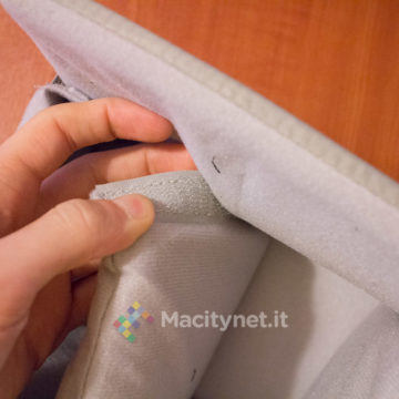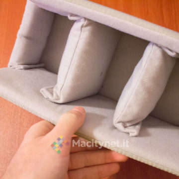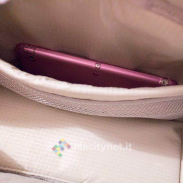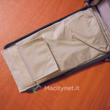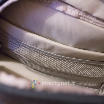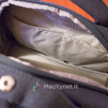 - Tasca superiore, la base (piatta) misura 25×10 centimetri, è alta 23 centimetri nel punto più alto, c’è spazio per una felpa arrotolata, una bottiglia d’acqua da mezzo litro e poco altro. All’interno ci sono altre tasche, nello specifico da un lato due taschini da 12×11 centimetri, dall’altro una più ampia tasca “a rete” ampia 10×25 centimetri. Infine, una più ampia tasca sullo schienale, misura 32×25 centimetri circa, comoda per un ultrabook o un iPad da 9.7‘’.