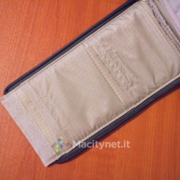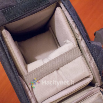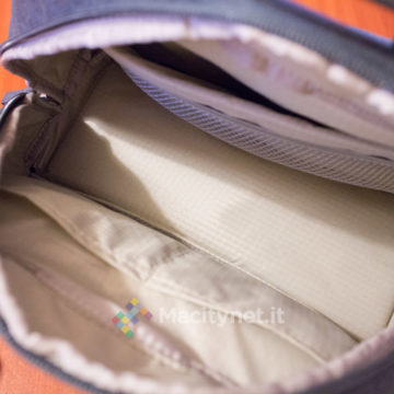 Abbiamo apprezzato la presenza di alcune tasche secondarie posizionate nella faccia interna delle due aperture che permettono di accedere alla borsa fotografica. Da un lato ci sono infatti due tasche, chiuse con del velcro, ciascuna che misura 6×9 centimetri, comode per il trasporto di schede di memoria ed altri piccoli accessori: dall’altro, una tasca più grande (18×9 centimetri) può essere usata per raccogliere le batterie secondarie della reflex, oppure filtri ND e poco altro.
