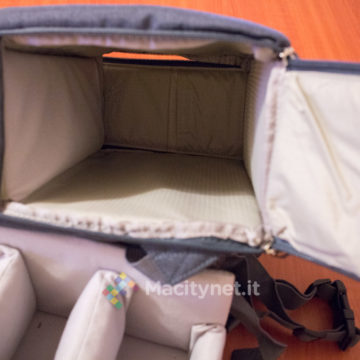 L’uso in questo senso dello zaino di Andoer è invece molto più intuitivo. Innanzitutto gli spallacci non si sganciano e non vanno indossati incrociati. Nel momento in cui si deve accedere alla sezione fotografica, vuoi perché vogliamo estrarre la reflex, oppure sostituire un obiettivo o semplicemente riporla a fotografie ultimate, è sufficiente sfilare uno spallaccio, far scivolare lo zaino sul fianco ed aprire la tasca laterale, sfilando l’interno come se fosse un cassetto.