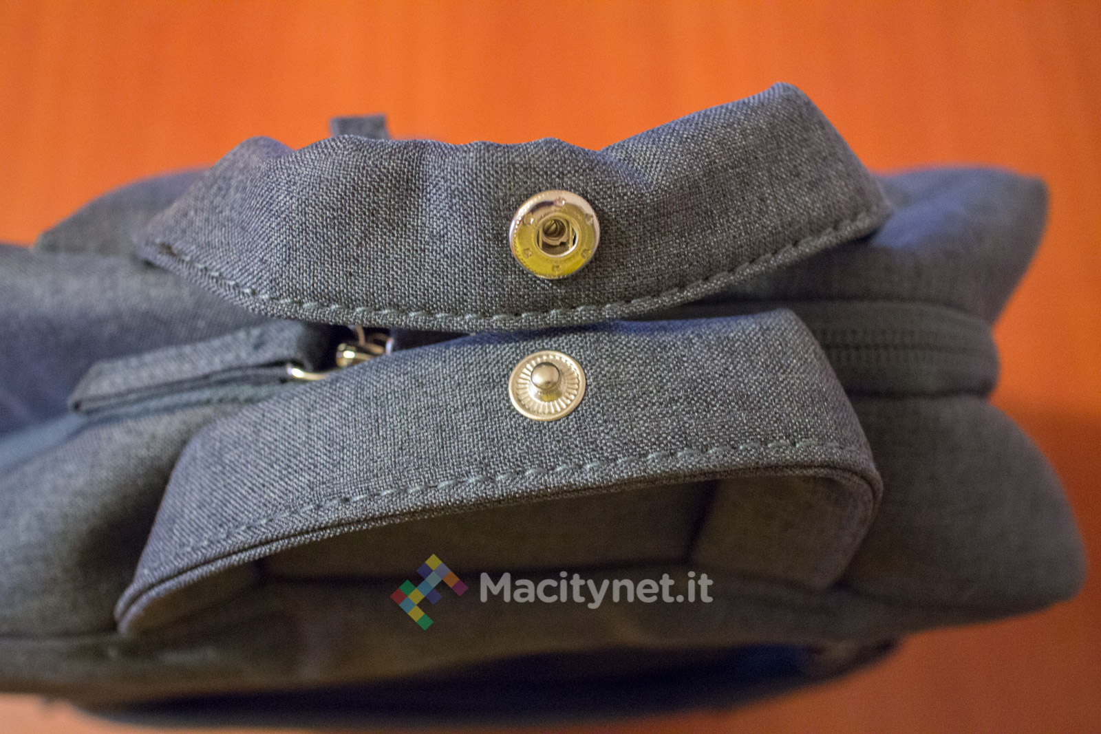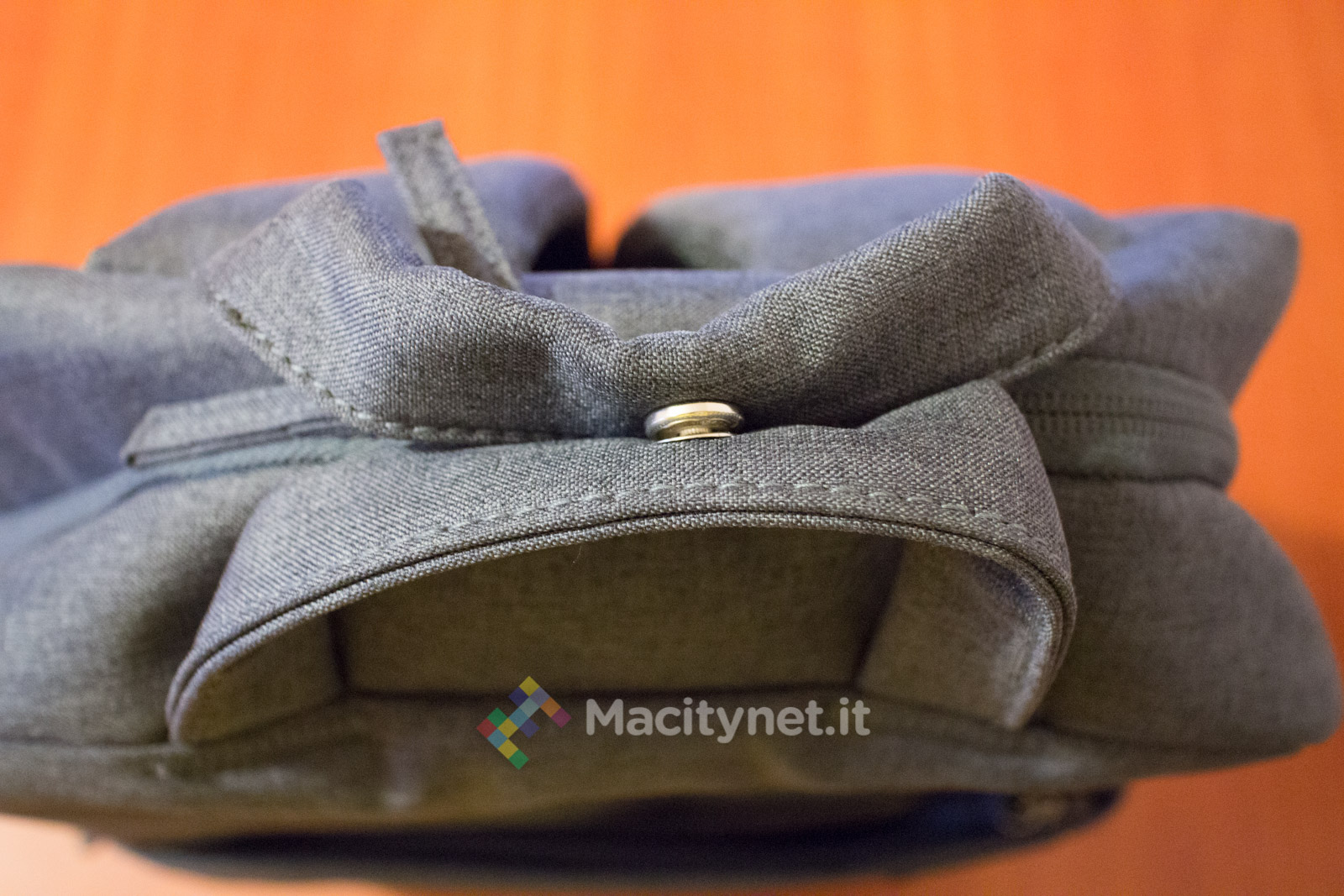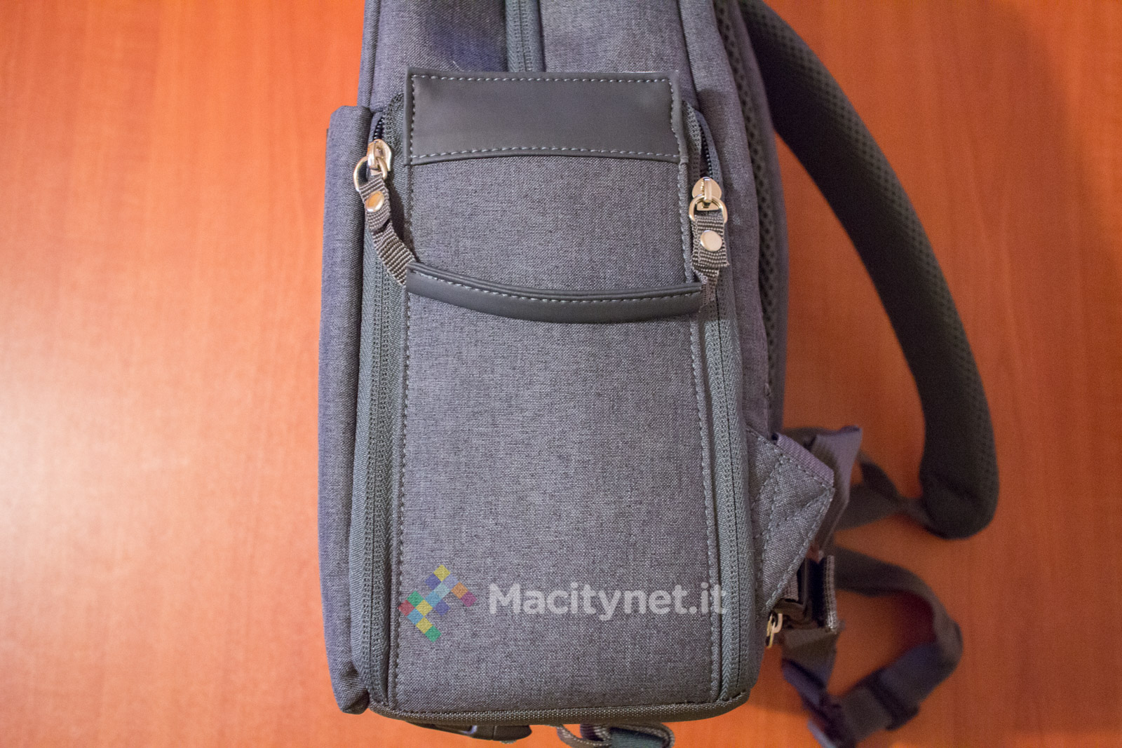 Dal lato opposto, invece, c’è una doppia maniglia che può essere più comodamente chiusa in una sola attraverso un bottone a pressione, aiutando nel trasporto dello zaino a mano.