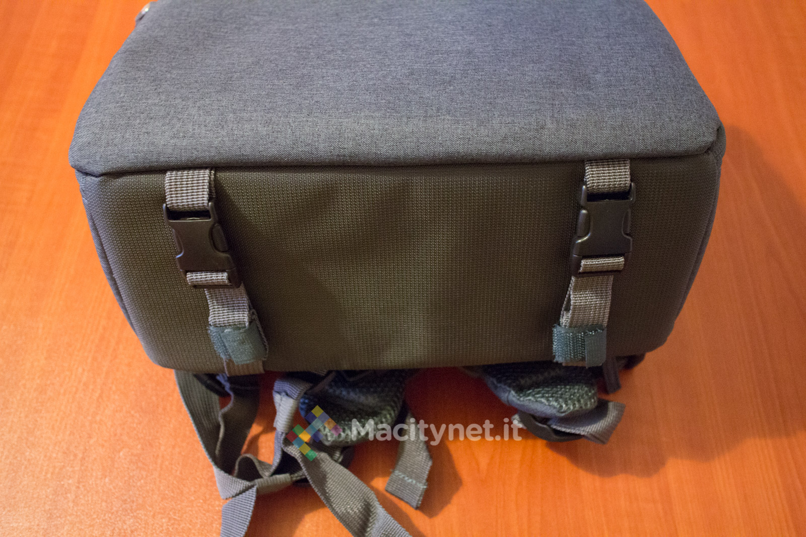 Sulla base, piatta ma spessa quanto basta per evitare danni all’attrezzatura riposta sul fondo, ci sono due fasce regolabili chiuse con due fibbie a clip che possono essere impiegate per l’aggancio di un treppiede.