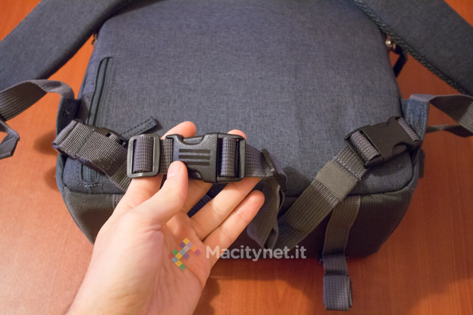 C’è poi una cintura (anche questa è regolabile e si apre e chiude attraverso una fibbia a clip) che aiuta a distribuire parte del peso intorno alla vita; manca invece un sistema simile sul lato superiore degli spallacci, che in base alla nostra esperienza riteniamo particolarmente comodo durante lunghe camminate specialmente in montagna, dove si spostano più facilmente tendendo a scivolare via.