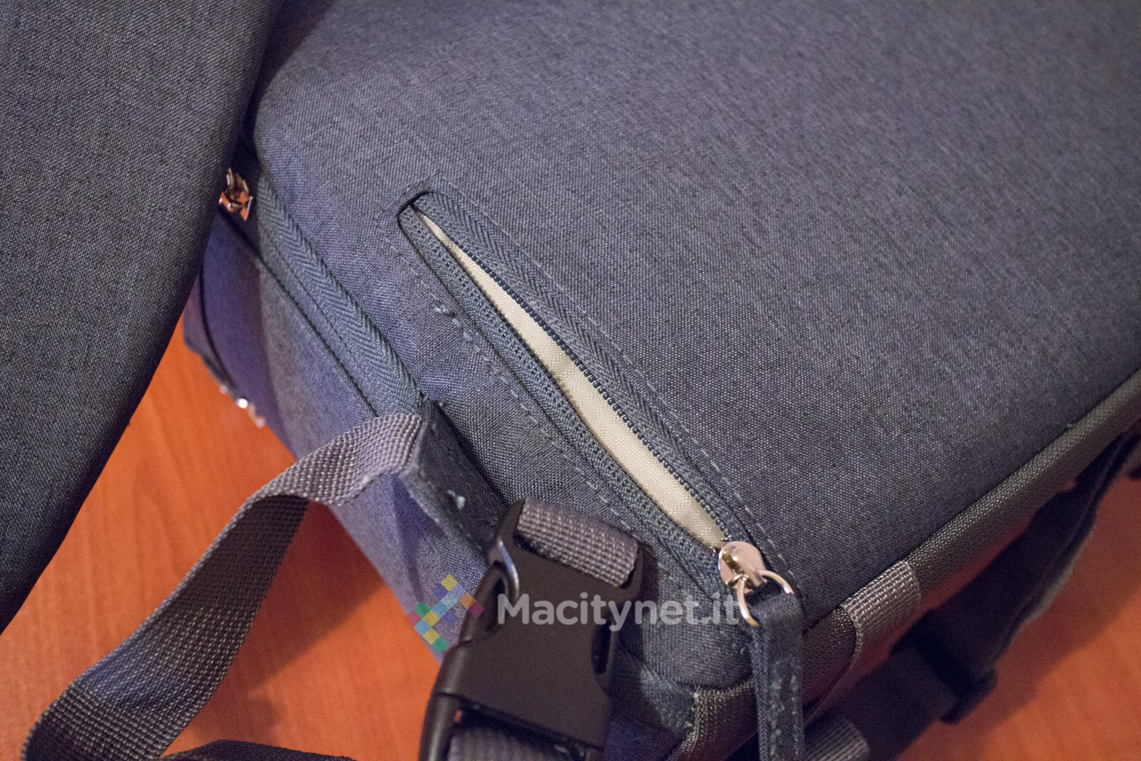 Parlando innanzitutto di estetica, se non fosse per le aperture laterali che facilitano l’accesso alla sezione reflex, si potrebbe tranquillamente scambiare per uno zaino di tipo comune per via della forma e della struttura. Di tipo monocromatico (nel nostro caso grigio scuro, ma è disponibile anche in grigio chiaro, violetto e blu elettrico), esternamente è caratterizzato da un robusto tessuto in nylon resistente a strappo, usura ed acqua.