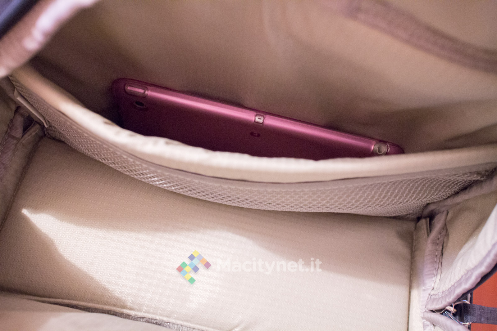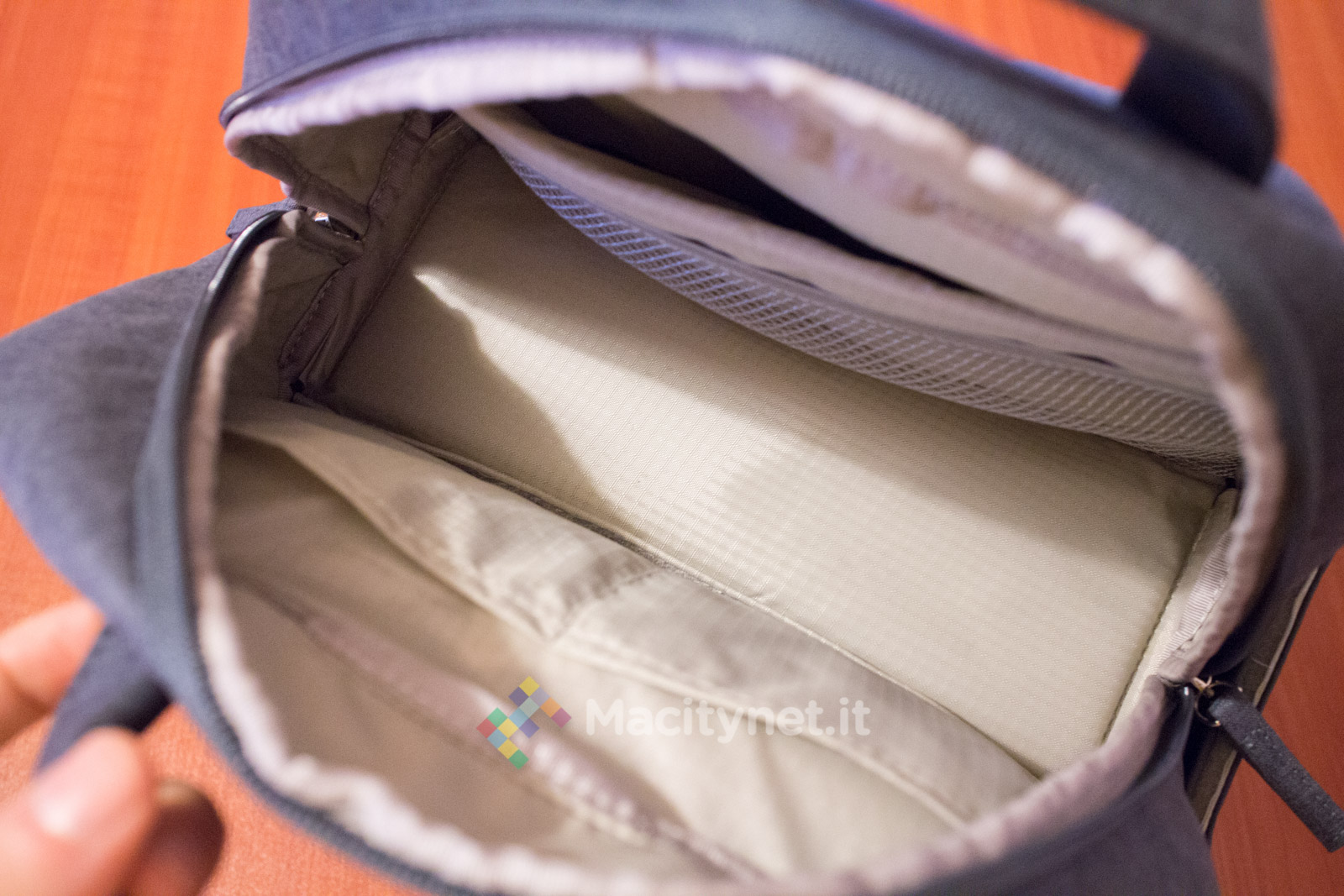 - Tasca superiore, la base (piatta) misura 25×10 centimetri, è alta 23 centimetri nel punto più alto, c’è spazio per una felpa arrotolata, una bottiglia d’acqua da mezzo litro e poco altro. All’interno ci sono altre tasche, nello specifico da un lato due taschini da 12×11 centimetri, dall’altro una più ampia tasca “a rete” ampia 10×25 centimetri. Infine, una più ampia tasca sullo schienale, misura 32×25 centimetri circa, comoda per un ultrabook o un iPad da 9.7‘’.