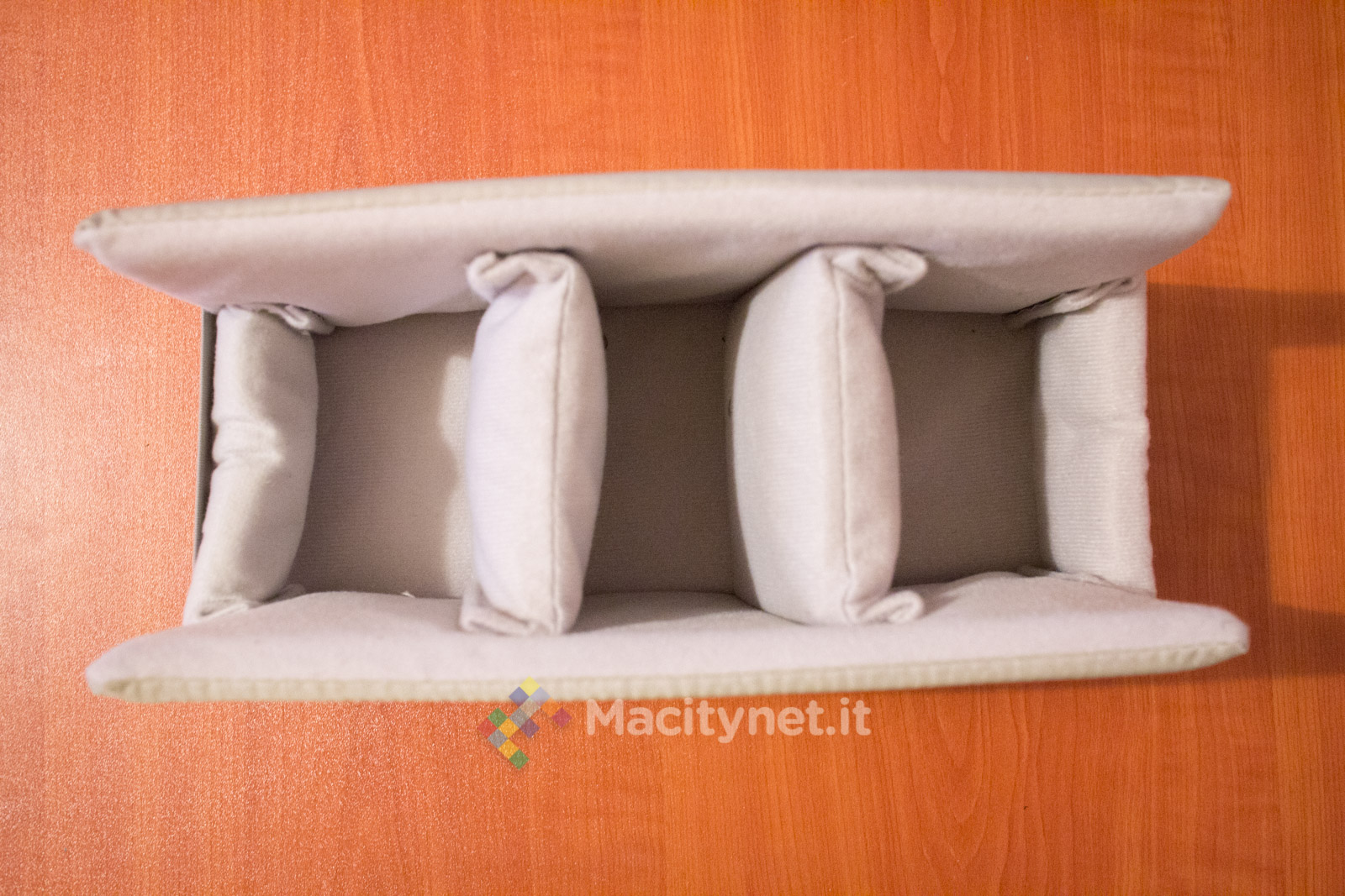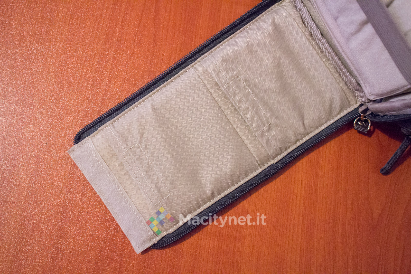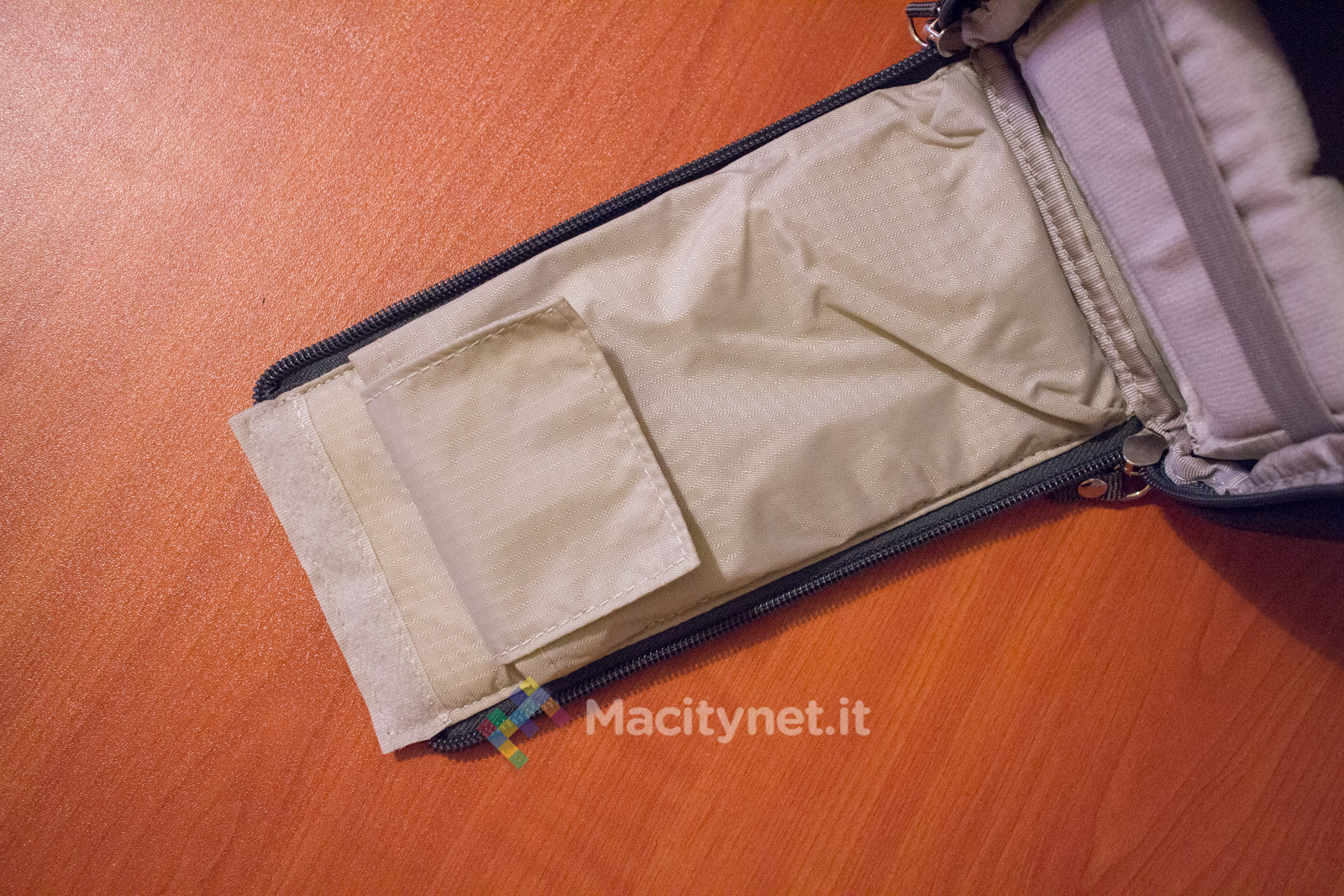Abbiamo apprezzato la presenza di alcune tasche secondarie posizionate nella faccia interna delle due aperture che permettono di accedere alla borsa fotografica. Da un lato ci sono infatti due tasche, chiuse con del velcro, ciascuna che misura 6×9 centimetri, comode per il trasporto di schede di memoria ed altri piccoli accessori: dall’altro, una tasca più grande (18×9 centimetri) può essere usata per raccogliere le batterie secondarie della reflex, oppure filtri ND e poco altro.