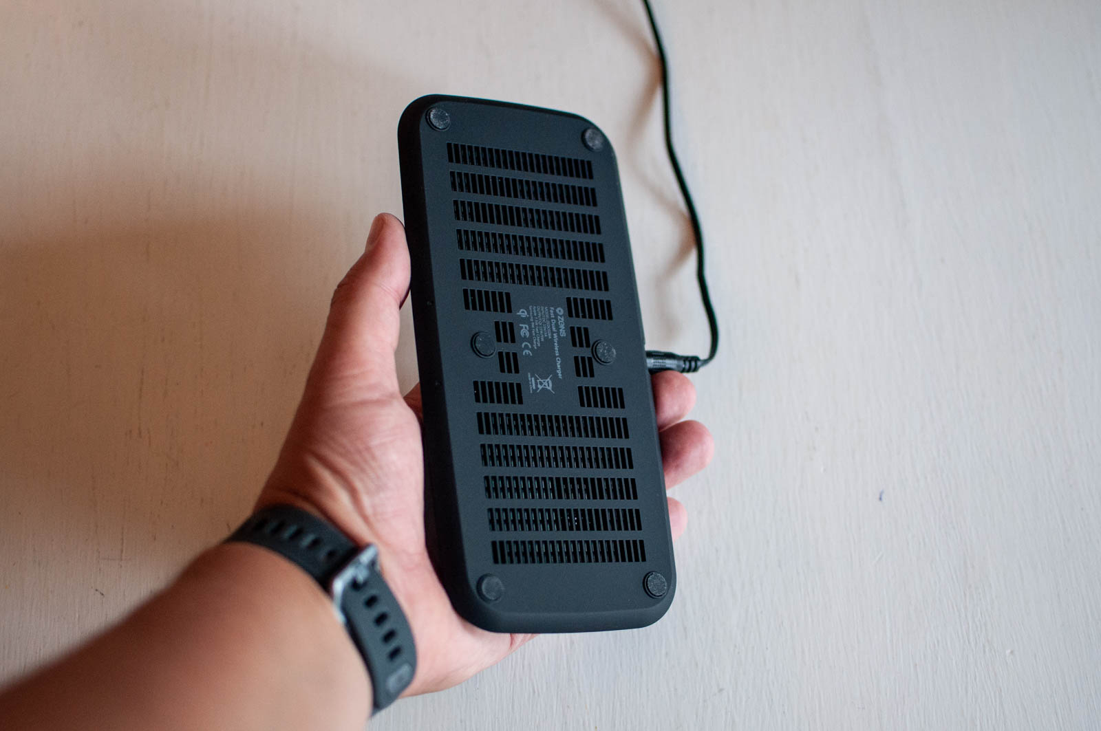 Ad ogni modo ZENS Dual Wireless Charger si presenta con un look molto sobrio, con nella parte superiore una gomma morbida e nella parte inferiore una griglia che, probabilmente, serve per disperdere il calore.