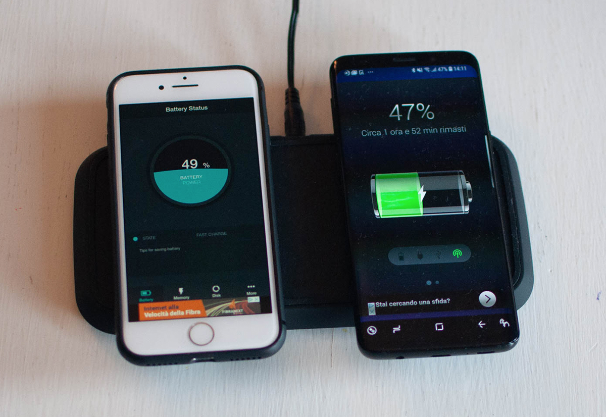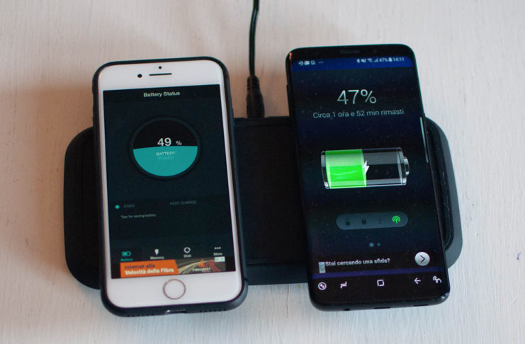 Per la prova abbiamo utilizzato due terminali molto recenti: un iPhone 8 e un Samsung Galaxy S9: la prima cosa che abbiamo capito è che ZENS Dual Wireless Charger opera sostanzialmente come due modelli singoli connessi ad un unico connettore, perché sembrano del tutto indipendenti.