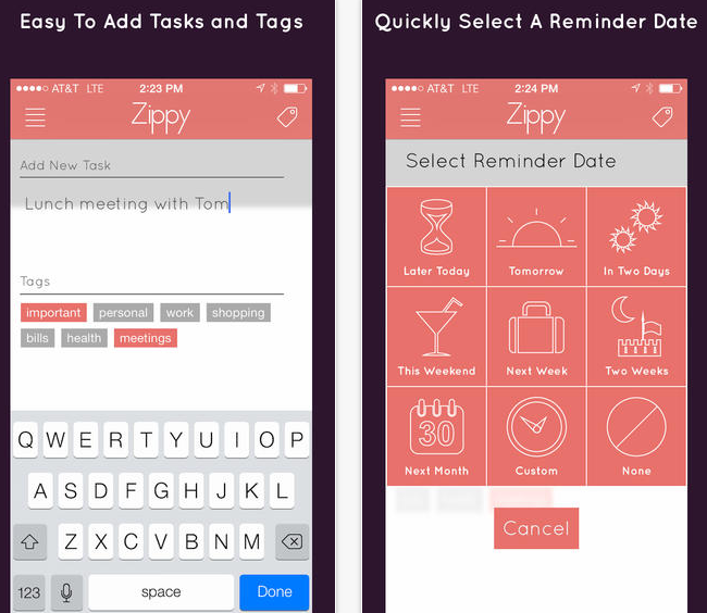Infatti, mentre la maggior parte delle applicazioni dello stesso genere presenti in App Store consente di aggiungere un’attività per poi modificarla a suon di tap e slide per inserire tag, tempi per le notifiche e altre informazioni, Zippy permette di velocizzare l’ intero processo. L’idea base che ha alimentato lo sviluppo dell’applicazione, infatti, è quella di far spendere all’utente meno tempo possibile per la creazione e l’organizzazione di un proprio compito, permettendogli di concentrarsi sui compiti da svolgere nell’arco della giornata.