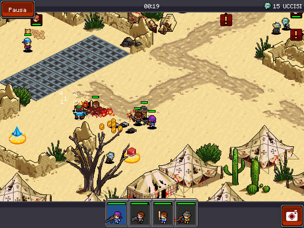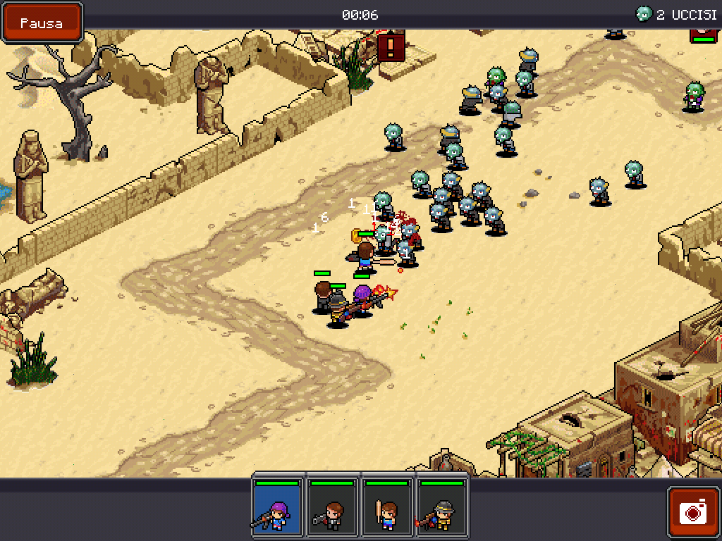 La prima differenza tra questo Zombie Commando e i molteplici prodotti con lo stesso tema riguarda proprio il personaggio da controllare. Questa volta, infatti, il giocatore non si troverà a guidare un eroe solitario, bensì un intero squadrone di prodi valorosi. Attraverso uno stick virtuale a schermo, che appare in qualsiasi area del display tramite la semplice pressione del pollice, sarà possibile guidare in qualsiasi direzione l’intero squadrone. Non sarà necessario sparare o effettuare altri tap o swipe a schermo, dato che il team di Zombie Commando farà fuoco automaticamente verso i non morti circostanti. Le varie missioni di gioco, che ammontano a circa 50 suddivise per 5 differenti mondi di gioco, richiedono per lo più di eliminare tutte le orde presenti, ma imporranno anche il salvataggio e il recupero di ostaggi e l’abbattimento di grossi boss. I mondi di gioco sono davvero caratteristici, abbastanza vasti e tutti riprodotti con il classico stile in pixel art, che serve a conferire al prodotto quel tono scansonato e allegro: si passa da deserti sabbiosi e misteriosi, a paludi fangose, città imperiali e freddi ghiacciai.