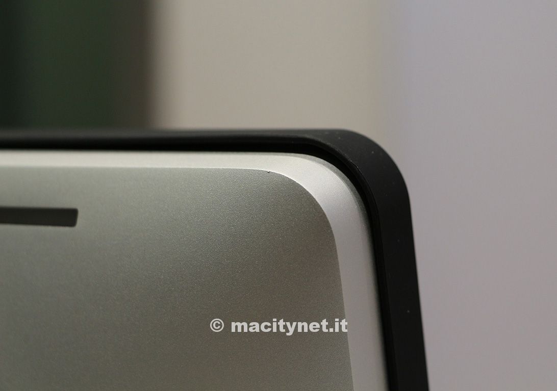 Abbiamo testato la cornice anche con un modello di iMac più recente con lo chassis più sottile (senza lettore DVD) e con il profilo frontale ridotto di qualche millimetro: Zorro Macsk riesce a rivestirlo senza problemi ma l’aggancio magnetico non funziona correttamente perché sfrutta i fianchi della cornice stessa e se la si vuole mantenere in sede occorre introdurre alcuni spessori all’interno; in più la foratura per la telecamera frontale risulta troppo ridotta e maschera circa un quinto dell’area inferiore di ripresa della telecamera stessa. Se riuscite a rendere stabile (magari con un biadesivo removibile) la cornice sull’iMac in modo che non ci sia spazio tra il fronte dello schermo e la cornice troverete che lo spazio intorno alla superficie visibile sarà proporzionato e corrispondente alla calibrazione standard.