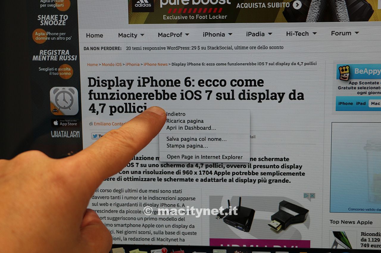 Anche se i tablet stanno aumentando pian piano le proprie dimensioni e gli all-in one touch con Windows 8 e Android sono da tempo in commercio c’è una controindicazione di fondo nell’utilizzare questi e pure iMac 21.5” in modalità touch: dopo un’ora di interazione le vostre braccia e le vostre mani saranno stanche di navigare sul grande schermo a meno che non teniate iMac pressoché orizzontale con l’aiuto di un piano ribassato e inclinato. In più alcuni particolari dell’interfaccia di OS X come i piccoli bottoni a semaforo che gestiscono l’apertura e la riduzione delle finestre sono veramente difficili da collimare e questo non dipende solo dalla precisione del sistema di puntamento ma anche dal fatto che molte volte il dito nasconde i piccolissimi oggetti da selezionare: le gesture dovrebbero sostituire l’accesso alle operazioni sulle finestre ma utiizzando anche il mouse viene “naturale” ripetere le operazioni tradizionali diretamente con il dito.