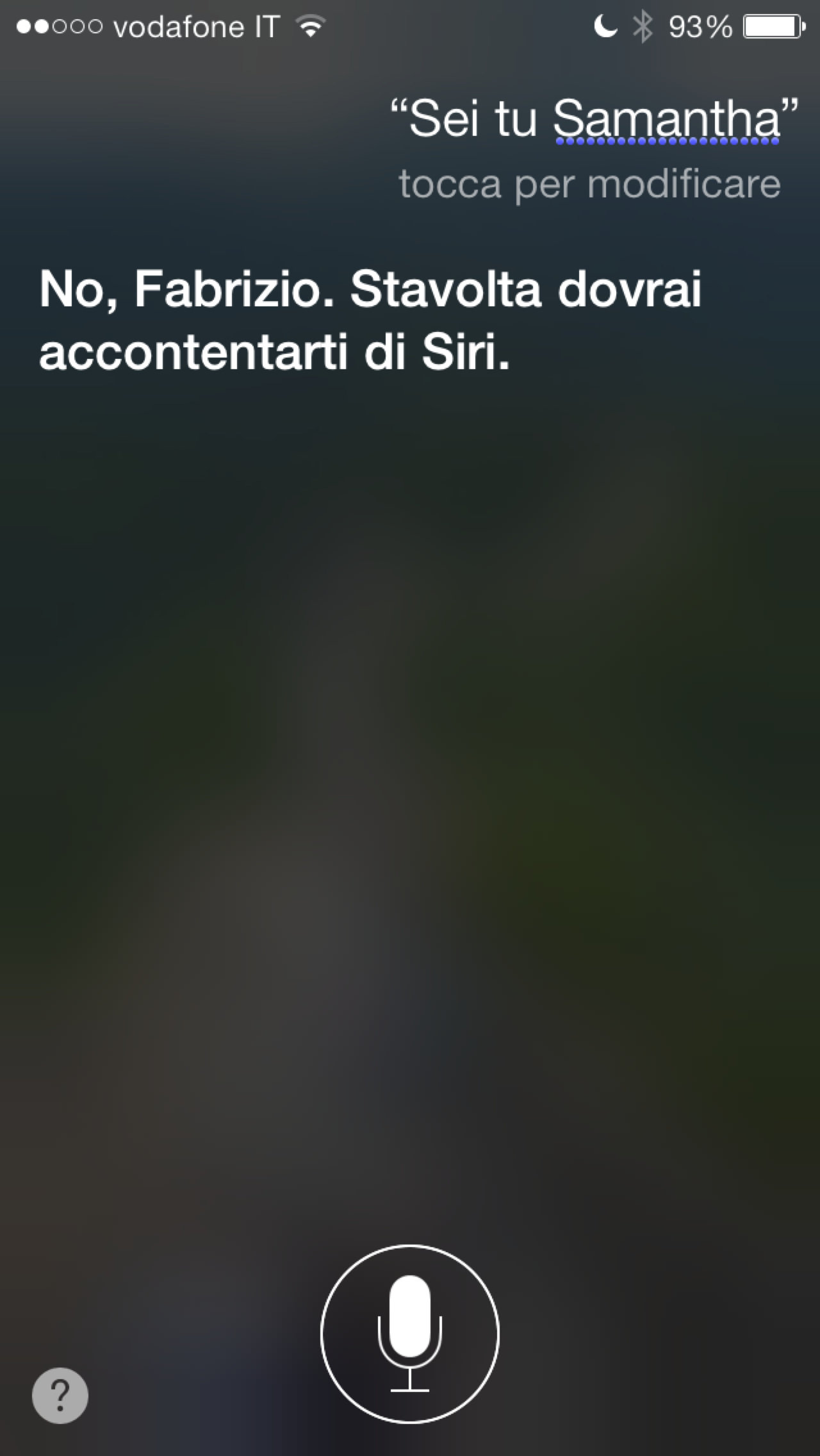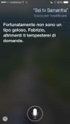 A distanza di qualche giorno la risposta della litigiosa Siri sulla sua “concorrente” è diventata: «No lei è solo un personaggio di fantasia, ma possiamo essere amici». Anche nella versione in italiano Siri risponde a domande su “Her”. Se le si chiede «Sei tu Samantha?», offre varie risposte come «No, ma chi si accontenta gode», oppure «Jochim, sei tu?». In altre occasioni Siri manifesta un po’ di… risentimento nei confronti dell’interlocutore